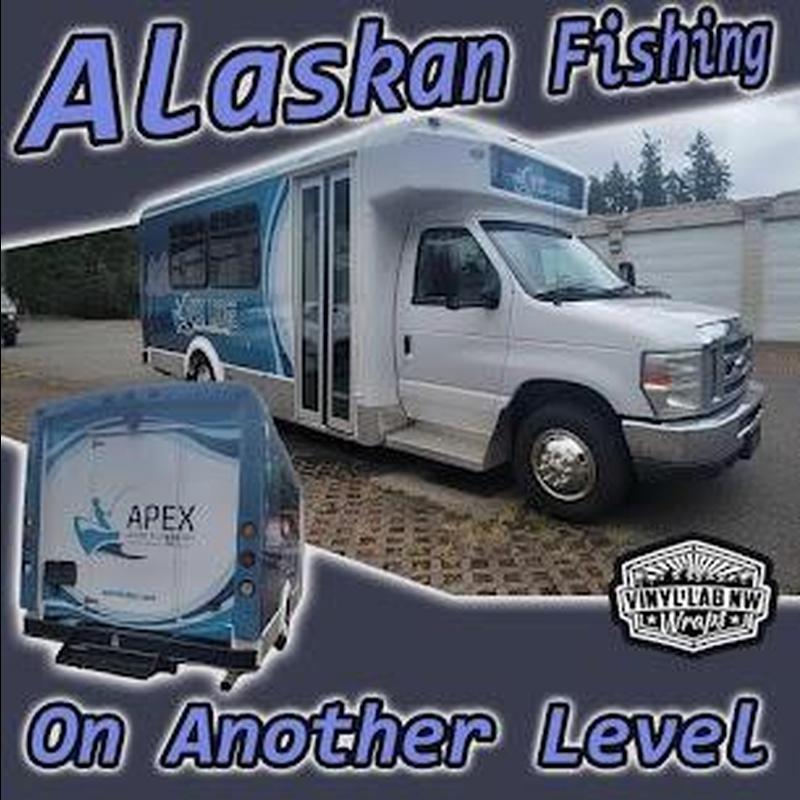Vinyl Lab Wraps installed a full custom vehicle wrap for Apex Lodge & Charters in Pelican, Alaska. The wrap uses Avery Dennison vinyl and was hand-laminated in-house to improve durability. This wrap covers the entire shuttle and presents a clear, cohesive brand image for commercial transport in the fishing and travel industry.